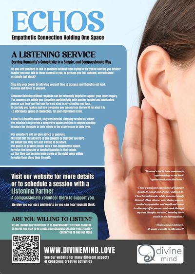 ECHOS is a donation based, fully confidential, listening service for adults. Our mission is to provide a supportive space and time to anyone needing to share the thoughts in their minds or the experiences in their lives.